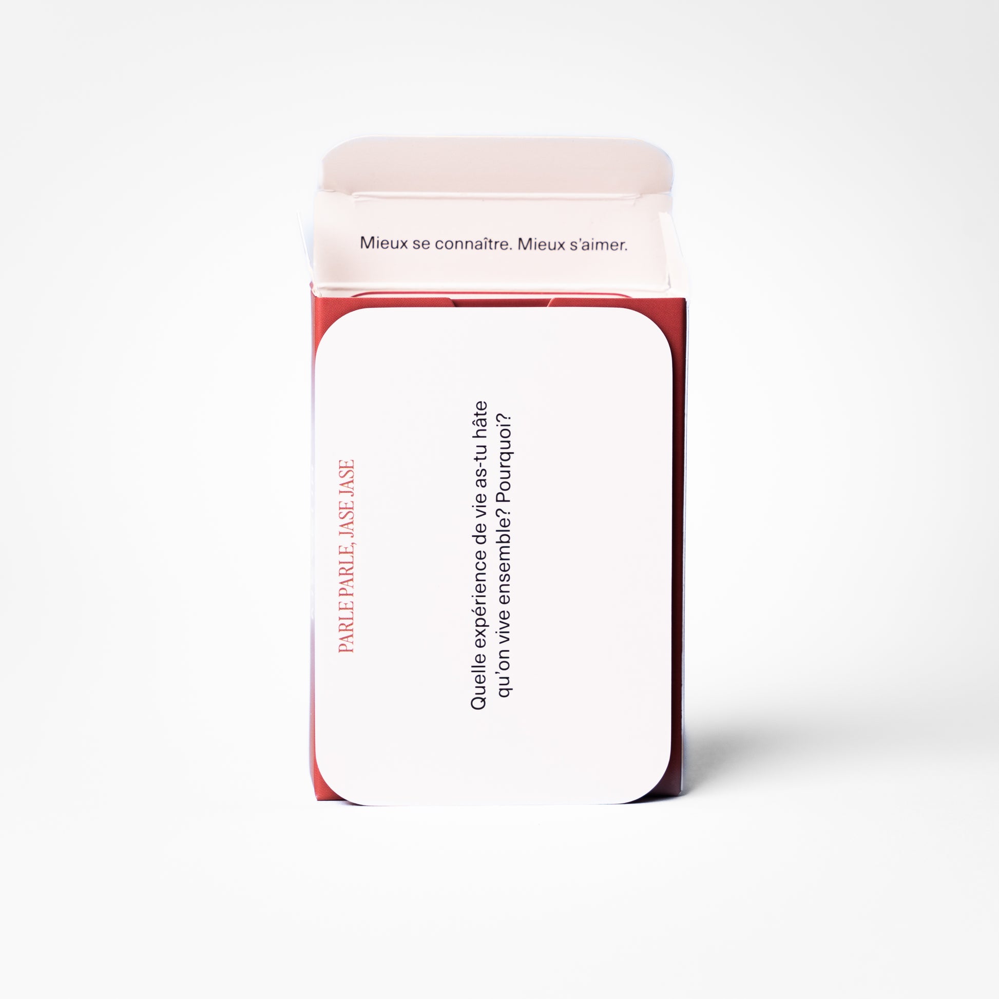 Faites-vous un cadeau et utilisez PARLE PARLE JASE JASE COUPLE avec votre partenaire pour ouvrir la discussion tout en douceur sur votre couple, vos émotions et tendre vers une relation plus épanouissante.