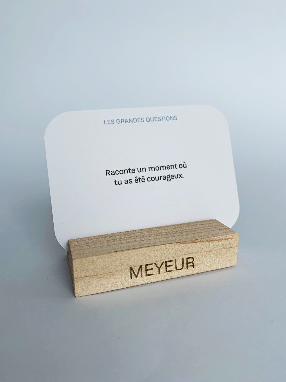 Disposez une carte du jeu "Les grandes questions" sur le porte-carte et placez-la à la vue, pour nourrir la réflexion au cours de la journée.